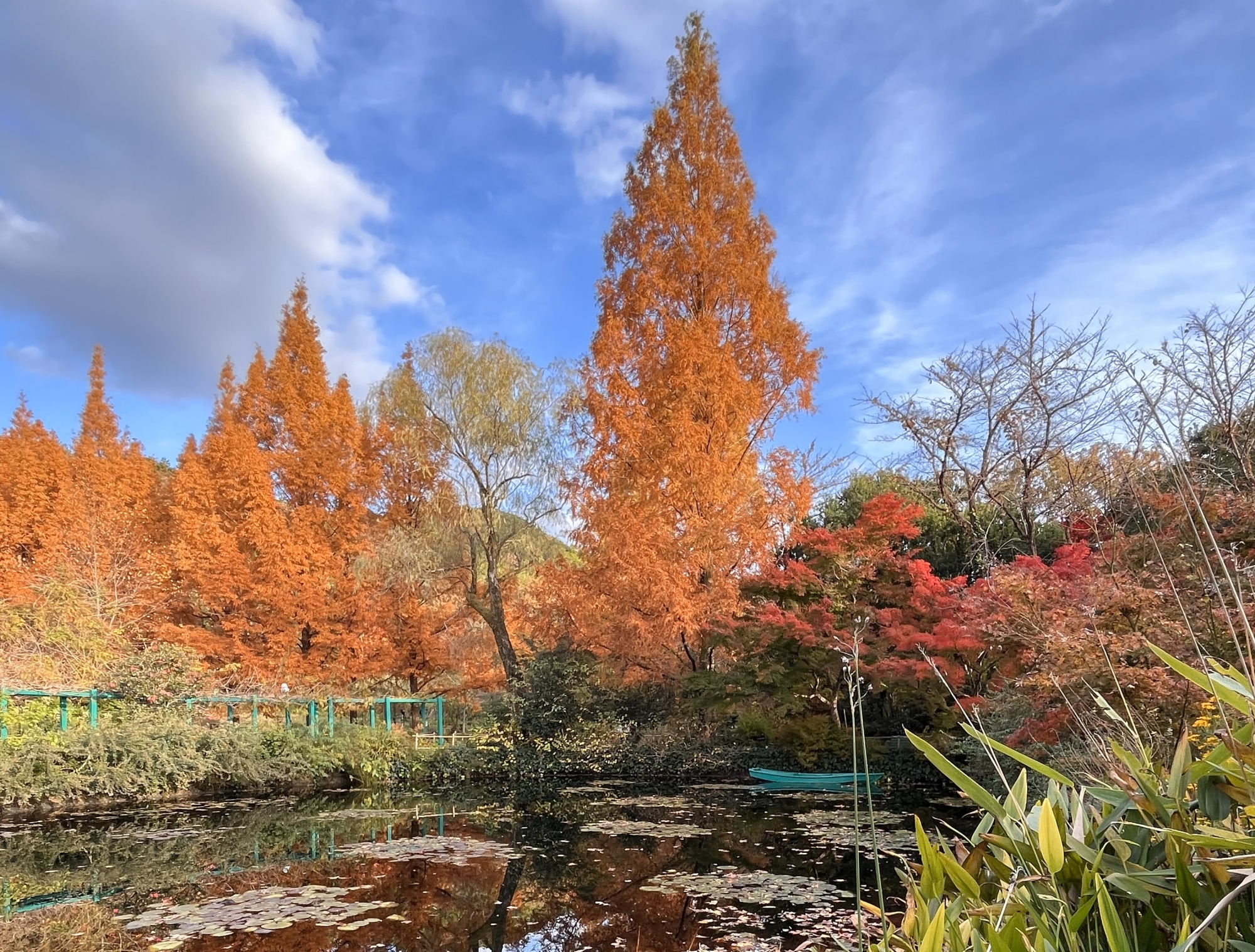 四国の高知県にモネの庭という、モネの池を模した庭園があります。セコイアの木を中心とした黄色や赤色に染まった木々がモネの池に映る風景は素晴らしいです。