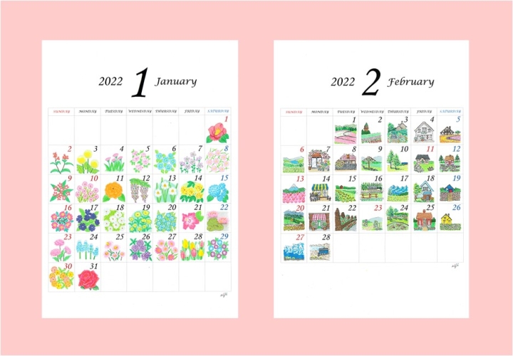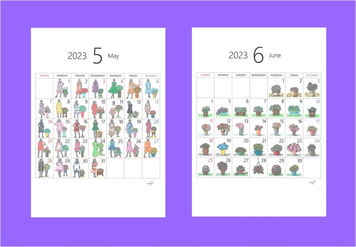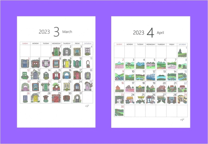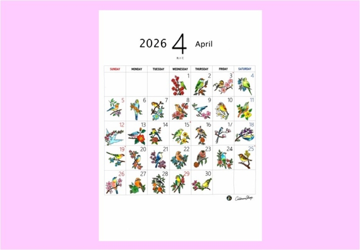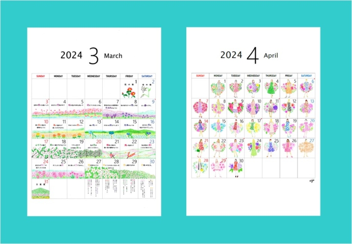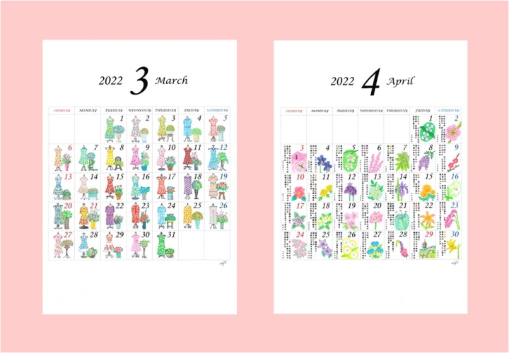 毎年楽しみにしています。3月の鳥と花、一羽一羽の小鳥のお顔の表情がかわいいです。4月の花の心象も、ひとつひとつほんわかして、癒されました。カレンダーの絵をハンカチとかプリントしたらかわいいと思いました。来年も日々かわいいカレンダーを見るのが楽しみです。ありがとうございます。