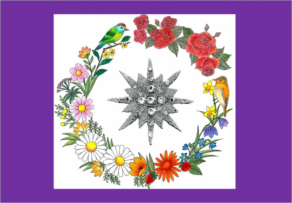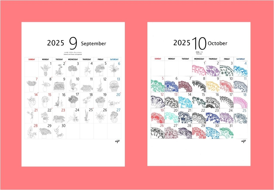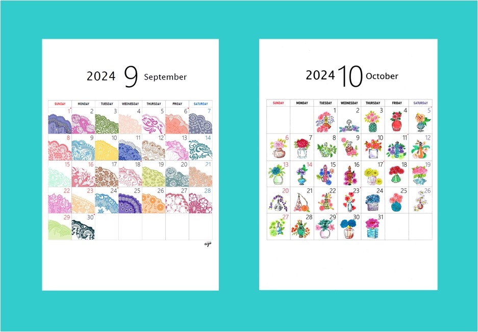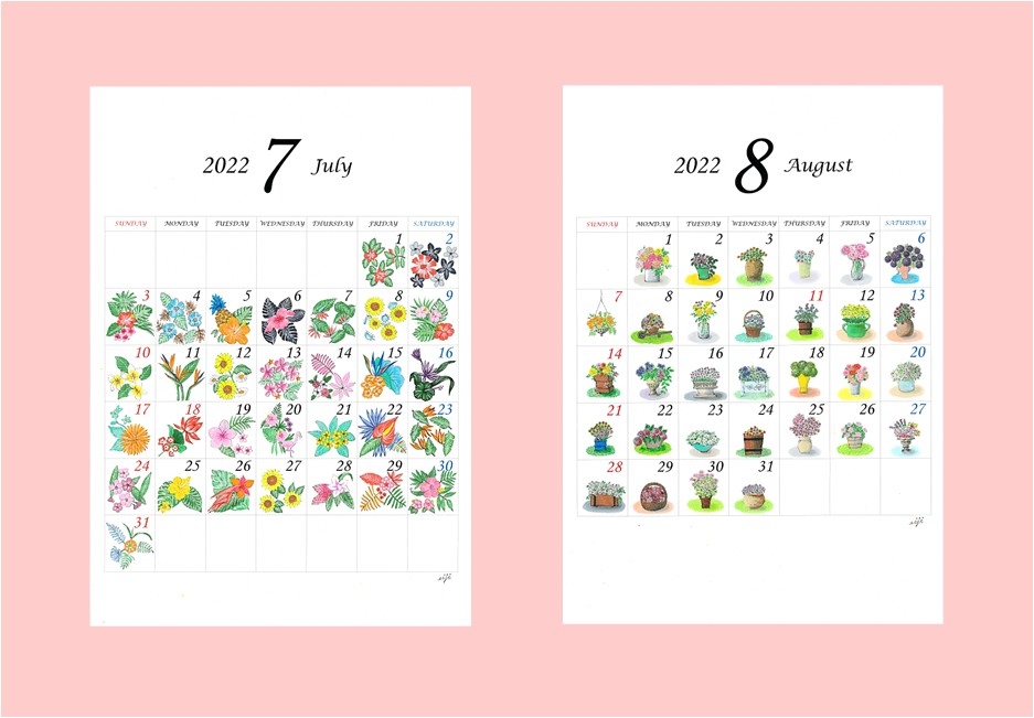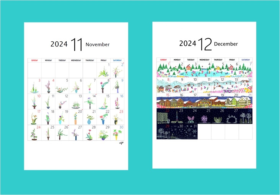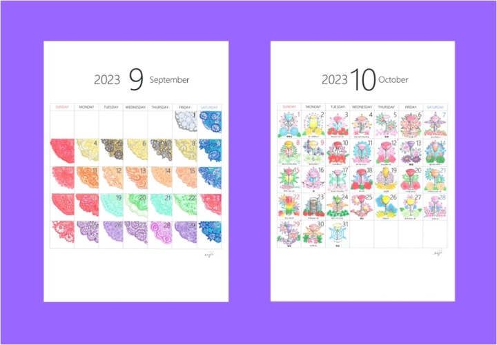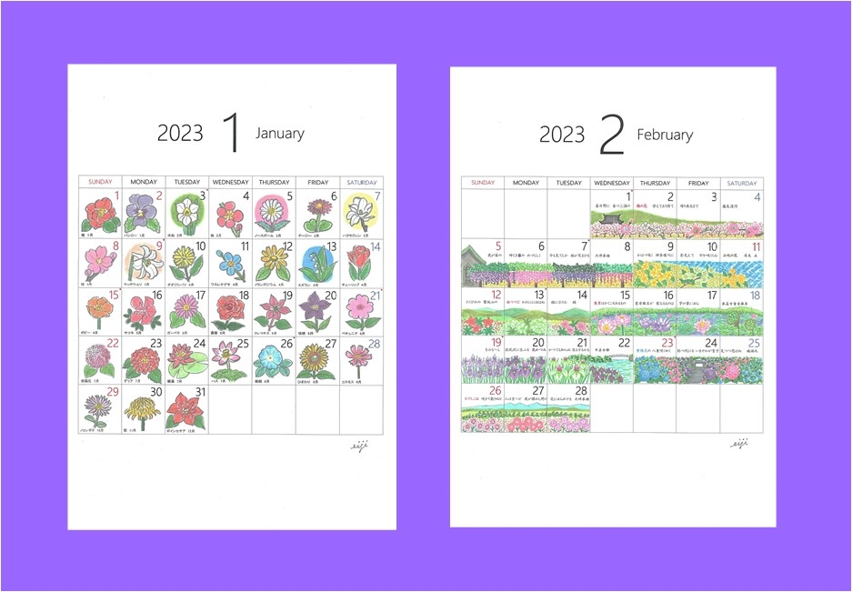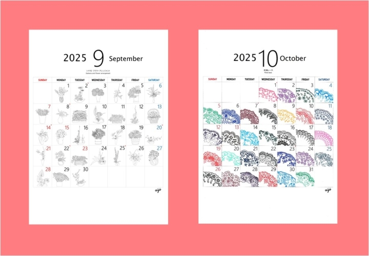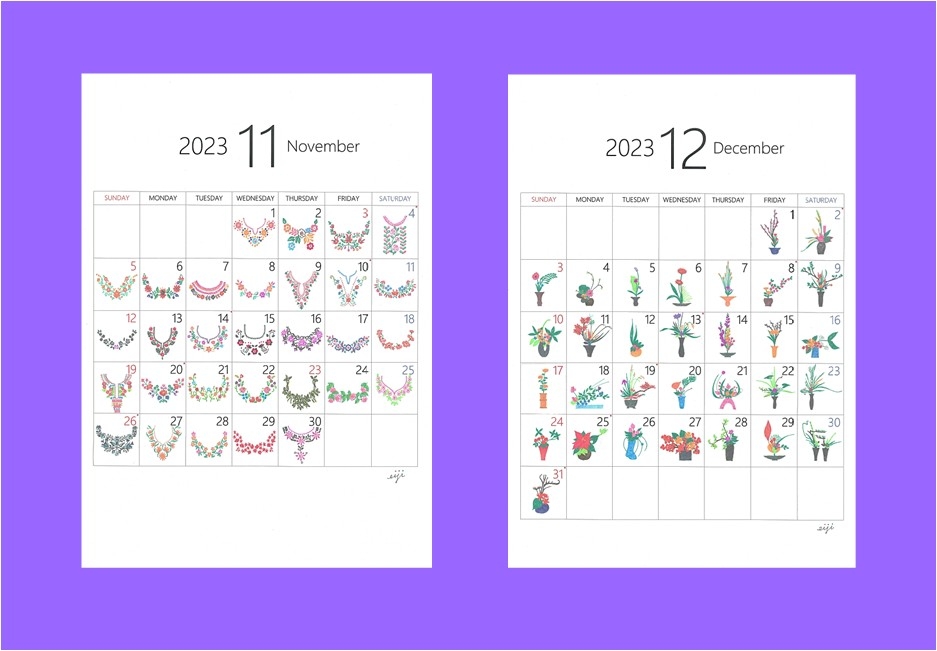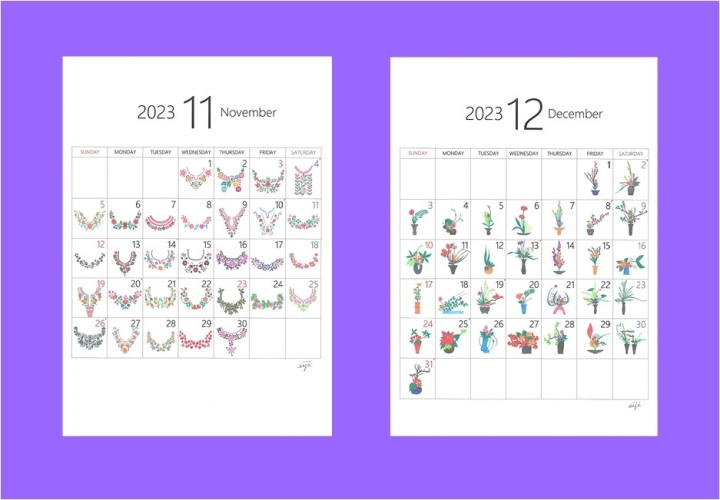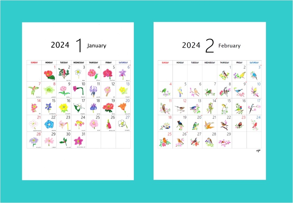 3月(鳥と花)は鳥たちがリアルですが、とにかく可愛い!(特に3/13)6月(四国の花庭園)・8月(四国の夏)は家族旅行(高松・小豆島)を思い出しました。4月(花の心象)は今までに見たことないお花の表現で、上生菓子のようです。表紙はビーズの質感をもっとよく見たかったです。9月(いけ花・フラワーアレンジメント)の生け花は拡大コピーして、ぬり絵にしたくなりますが、この花、葉の色は何色だろう?と普段使わない思考回路になりそうです。今年も楽しいカレンダーをありがとうございました。