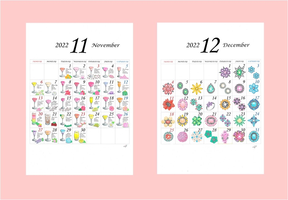 色彩の美しい月を選びました。源氏物語やカクテルなど、一言、情報が入っているのも面白いと思います。