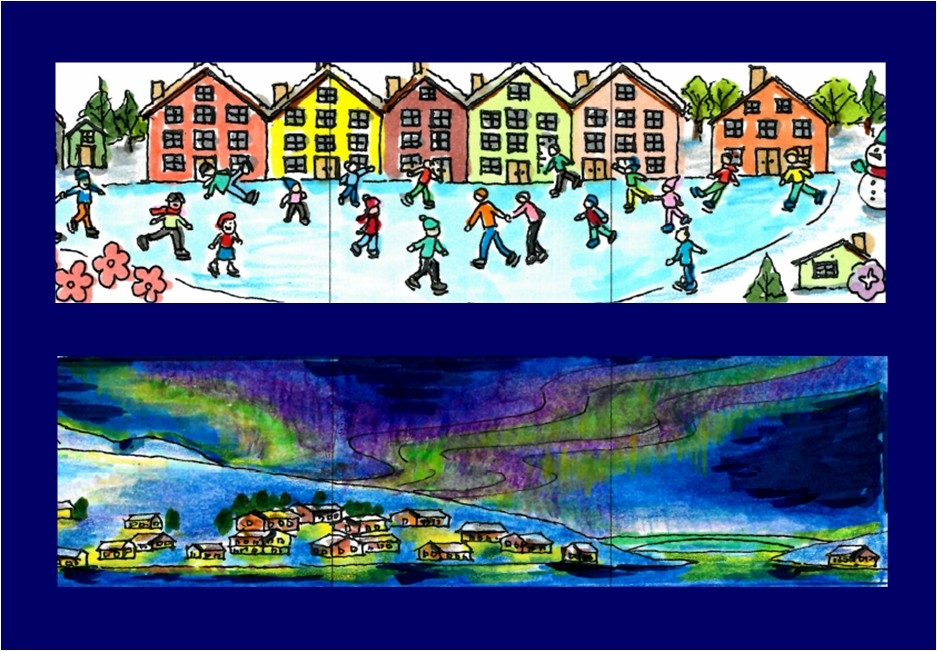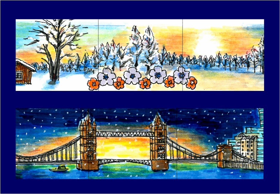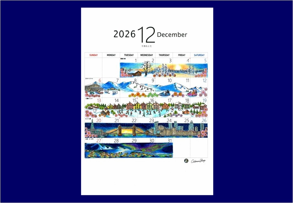 12月のテーマは冬景色と花です。「みなさん1年間お疲れ様でした」という思いで描きました。