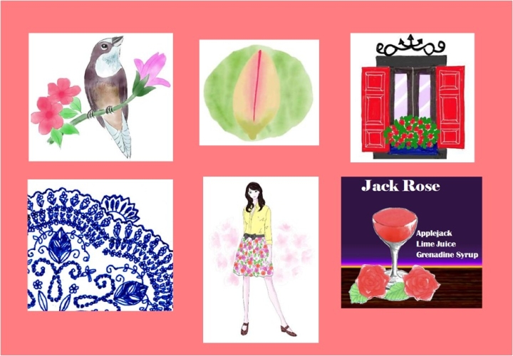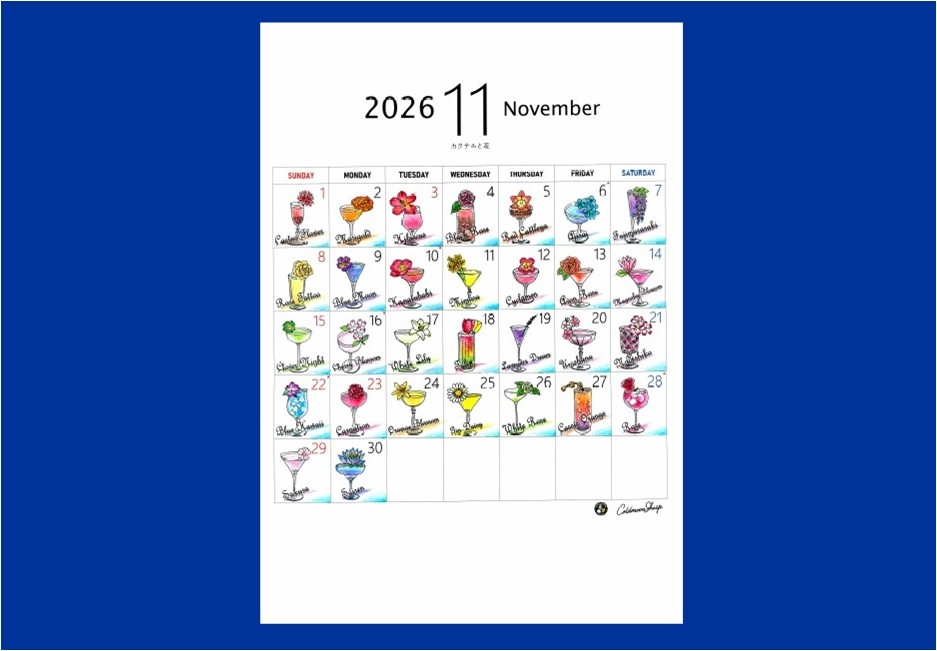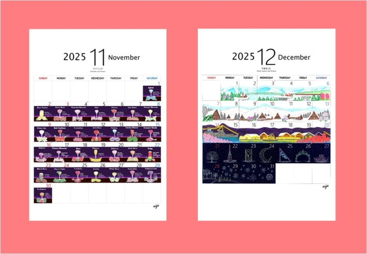 6月(四国の花庭園)は、生まれ月でもあり目が行きます。真ん中はアヤメでしょうか。青紫色が好きです。12月(冬景色と花)は、雪国新潟育ちの私には懐かしいです。雪景色の白と都会のイルミネーションの夜の闇、白と黒の対比で好きです。8月(四国の夏)は、風景や行事に日本の夏を感じます。11月(カクテルと花)は、趣の変わったデザインが入ることで、全体に奥行きを感じさせます。バックの黒や英文がエキゾチックな気分にさせます。表紙は、よく見ると五羽の鳥が見えます。構図やそこにある花や鳥の種類や色調が素敵で、全体のデザインが柔らかく、花🌸ごよみの表紙にふさわしいです。