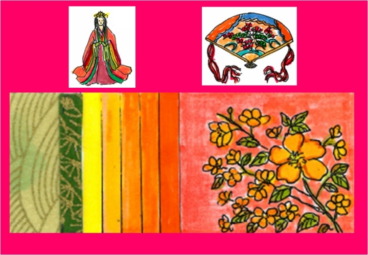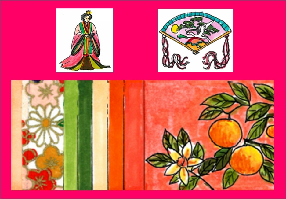 今年は源氏物語の時代の女性が着ていた十二単の色の合わせ方で、花の名前がついた合わせ方を紹介します。